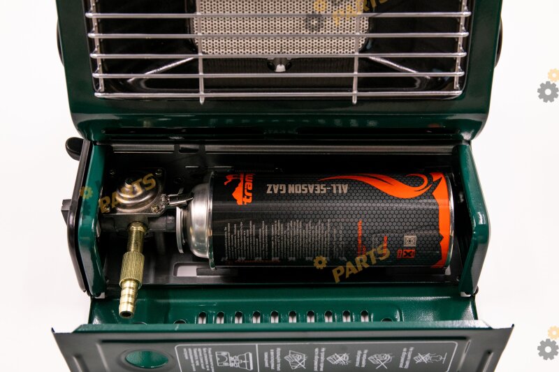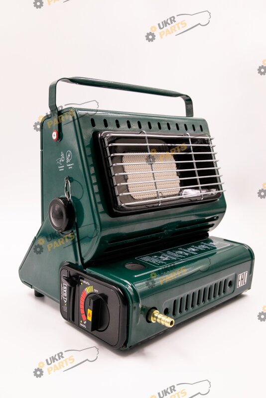 Обогреватель снабжен клапаном контроля давления газа и устройством настройки защитного картриджа, а так же удобной ручкой в верхней части корпуса для переноски.