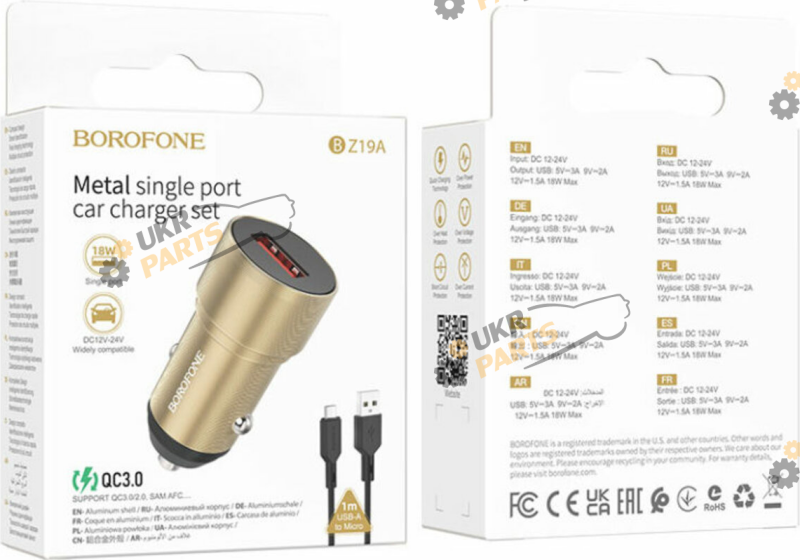 Автомобільний зарядний пристрій BOROFONE BZ19A Wisdom single port QC3.0 car charger (Micro) Gold забезпечує швидкий і стабільний заряд. У пристрої передбачена багаторівнева система захисту від перегріву, перевантаження і короткого замикання.